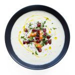 Reparte el ajoblanco en boles. Coloca en el centro los langostinos + el jamón y decora con las semillas + la menta. Sirve.