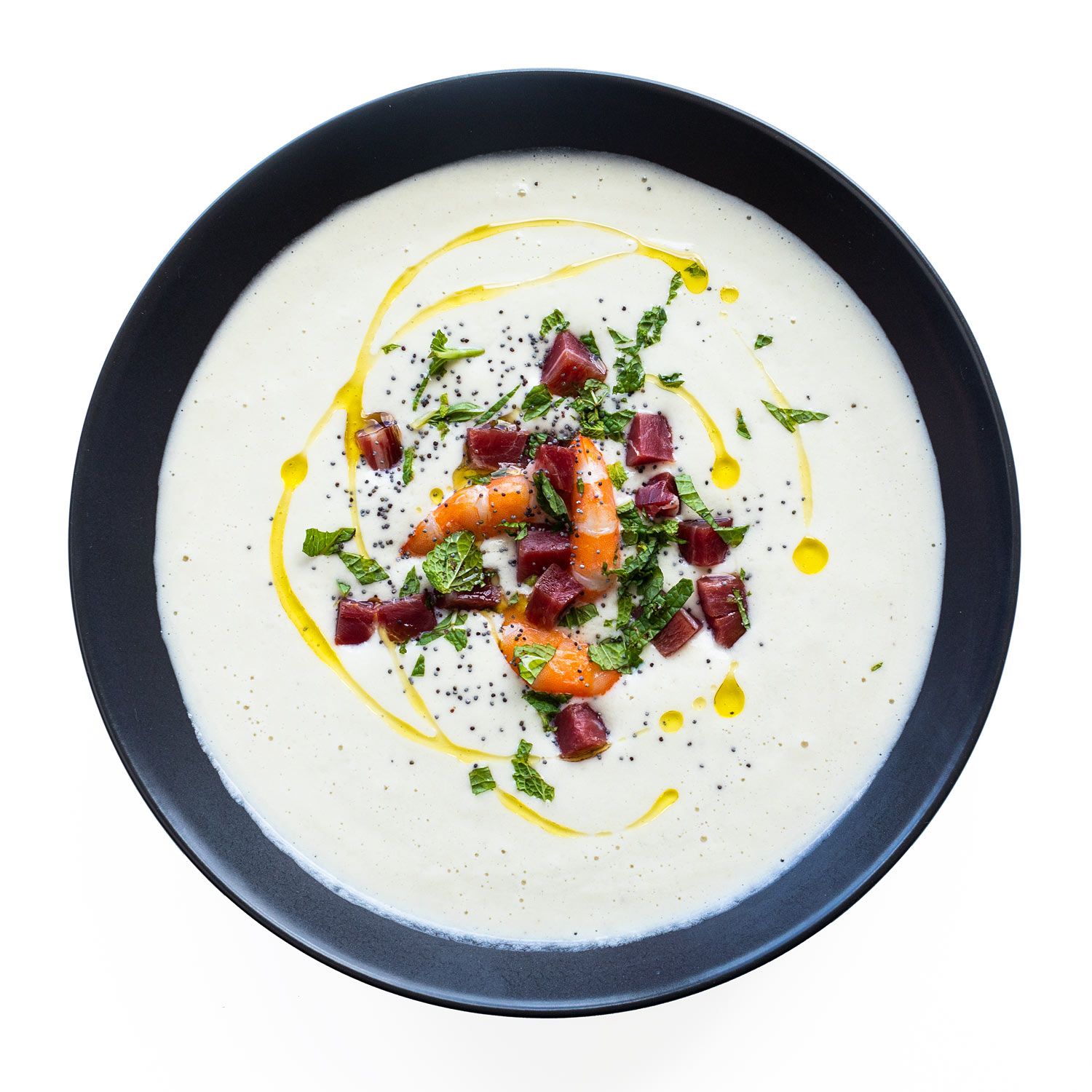Reparte el ajoblanco en boles. Coloca en el centro los langostinos + el jamón y decora con las semillas + la menta. Sirve.