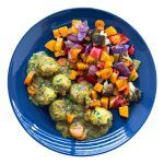 Sirve las albóndigas y decora con el cebollino. Acompaña con las verduras.