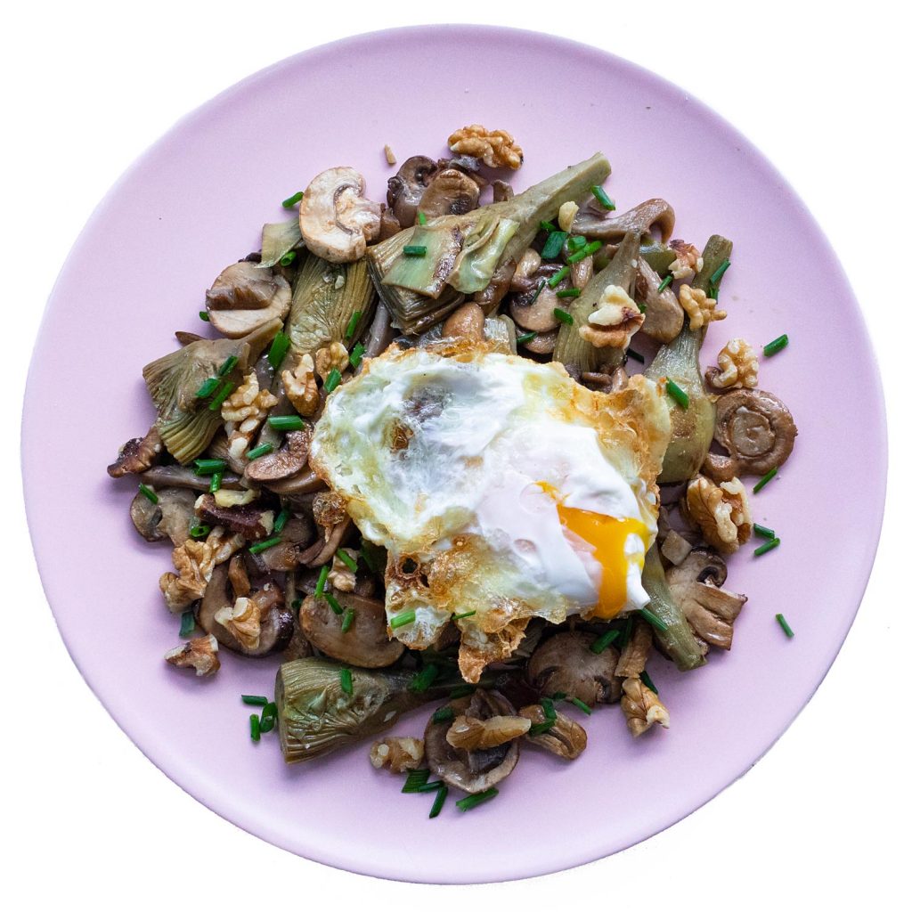 En la misma sartén, añade 1 Tbsp aceite de oliva + las setas + ¼ tsp sal y saltea durante 5 minutos. Vuelve a añadir las alcachofas + el ajo + el vino y deja evaporar el alcohol durante 5 minutos. Prueba el punto de sal.