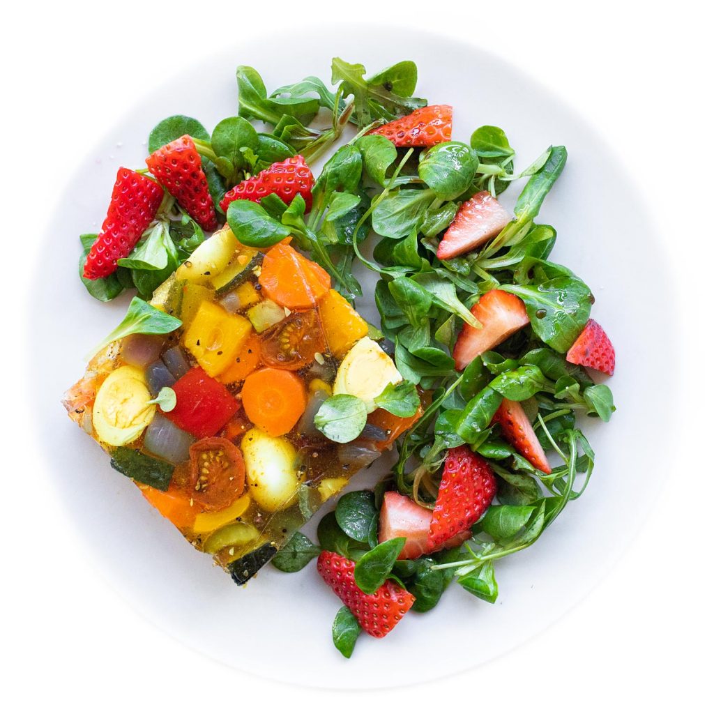 Desmolda el aspic sobre un plato y acompaña con la ensalada. Decora con las semillas y sirve.