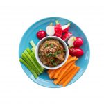 Decora el baba ganoush con el cebollino y sirve junto a los crudités.