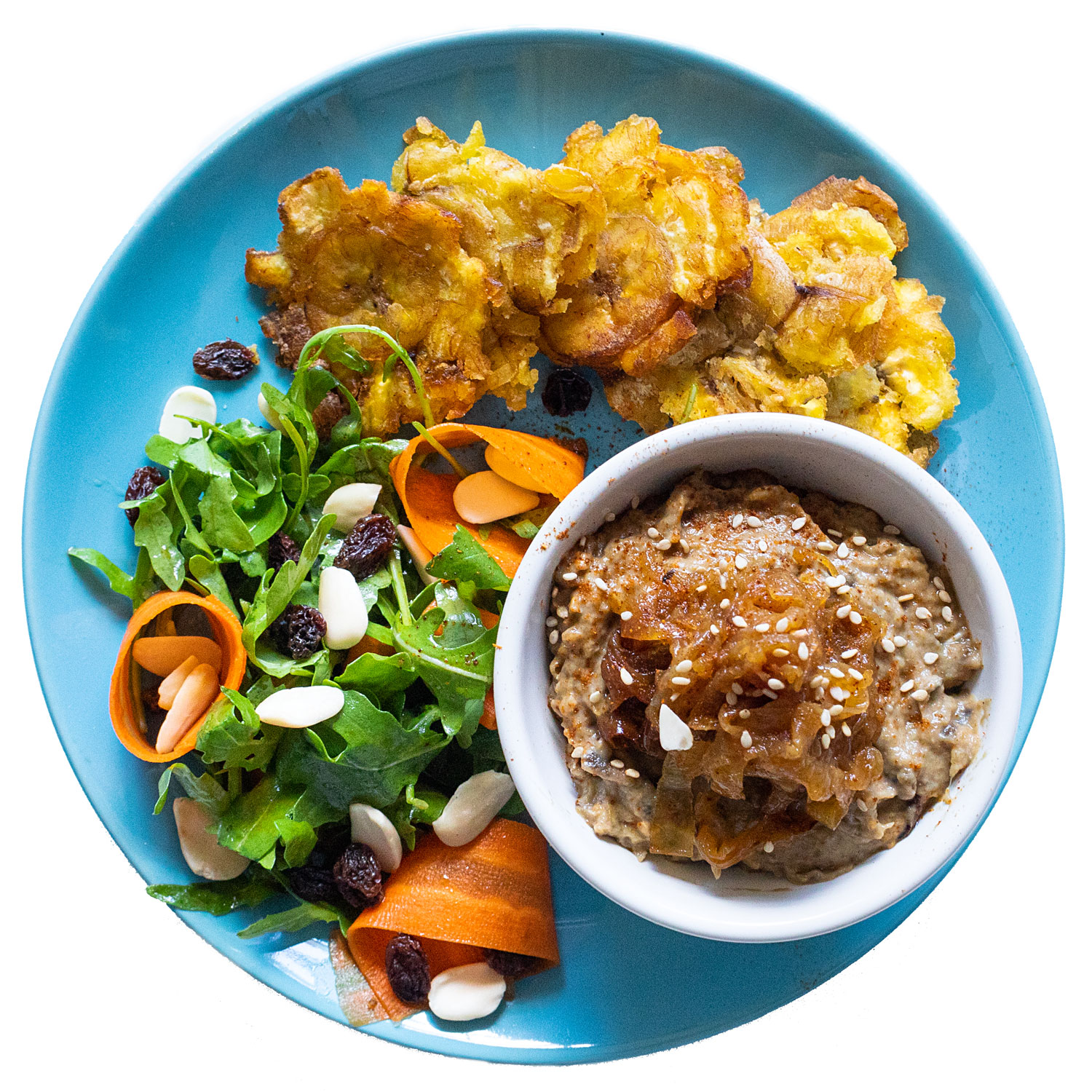 Sirve el baba ganoush con los tostones + la cebolla caramelizada y acompaña con la ensalada.