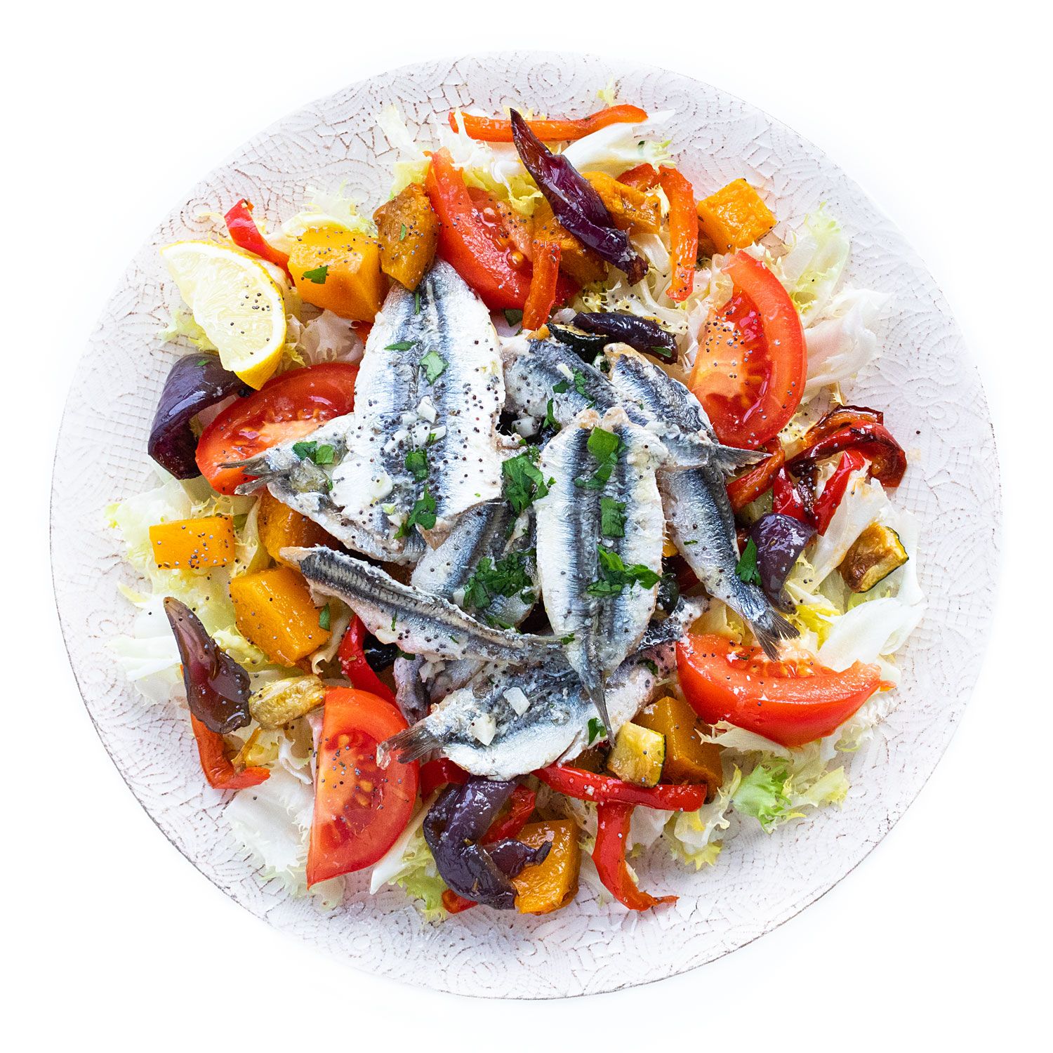 Sirve los boquerones con verduras sobre la ensalada y decora con las semillas. Rocía con el zumo del limón.