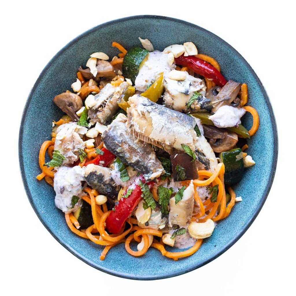 Mezcla en un bol todos los ingredientes (excepto las sardinas y el tzatziki).