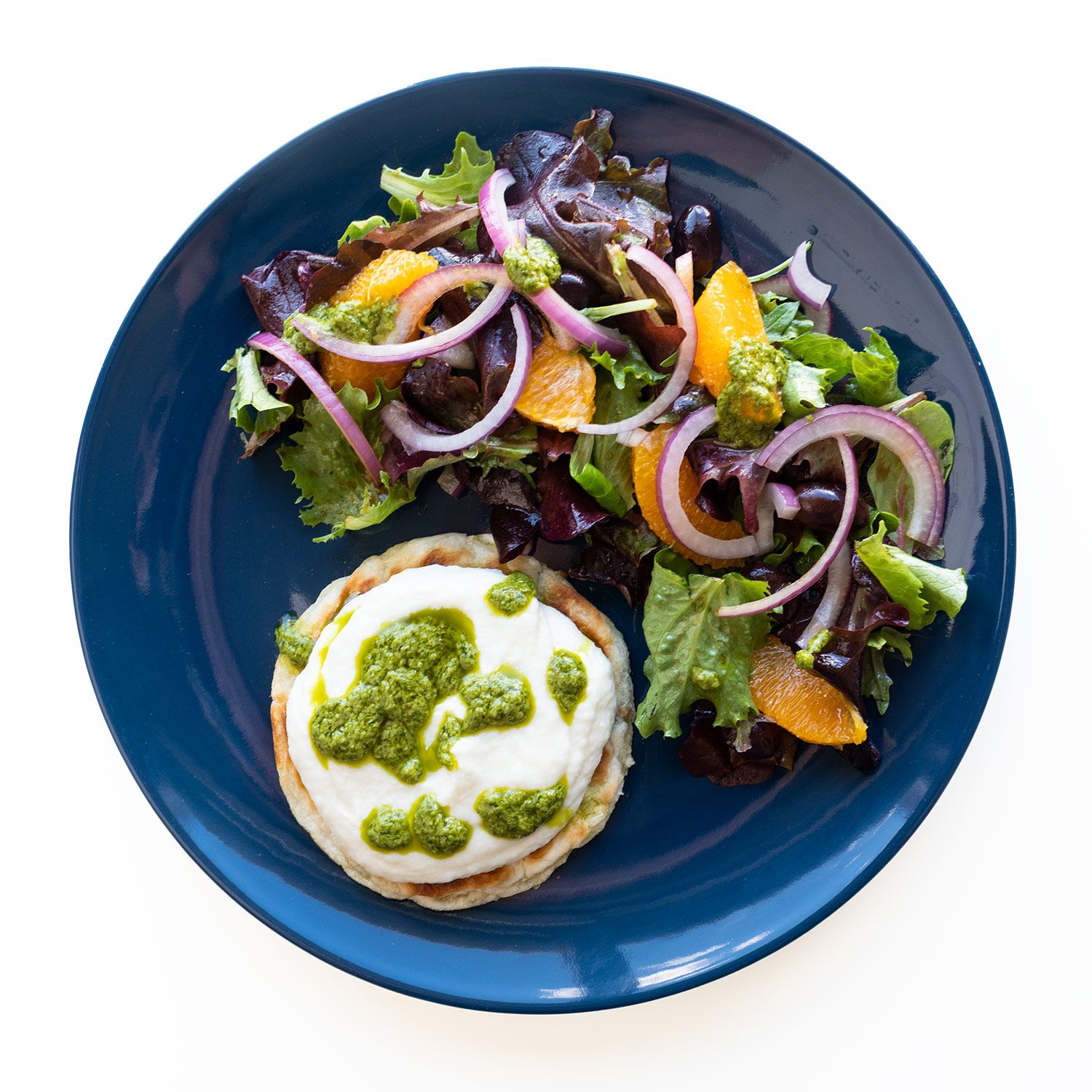 Reparte la brandada de bacalao sobre las tostas, salsea con el pesto y acompaña con la ensalada.