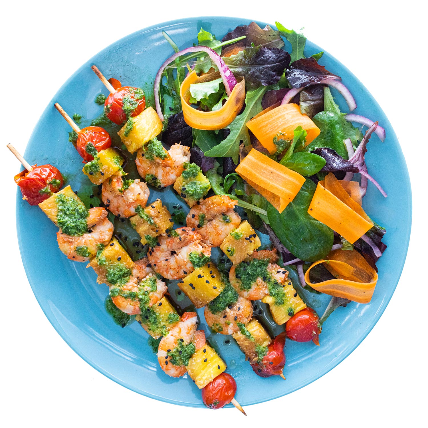Sirve las brochetas con la salsa y acompaña con la ensalada.