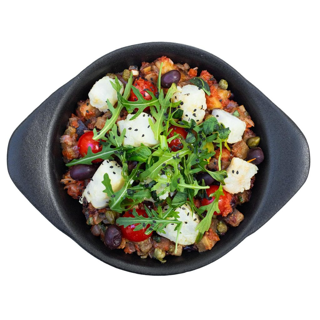 Calienta el horno a 180 ºC. Cubre una fuente apta para horno con la caponata.