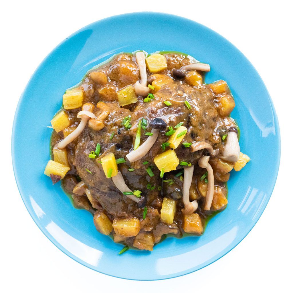 Pon la tapa y cocina durante 2 horas y media o hasta que estén tiernas y se desmiguen con facilidad. Cuando queden 5 minutos para terminar la cocción, añade la piña y remueve. Si quieres, puedes retirar la carne y triturar la salsa antes de añadir la piña. Prueba el punto de sal.