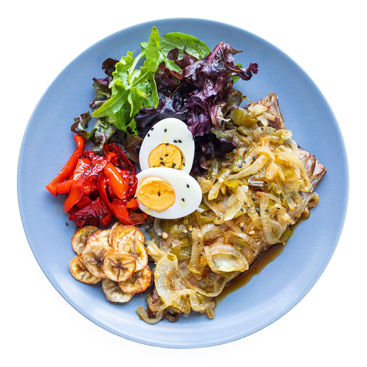 Sirve el chicharro con los huevos + los pimientos + los chips. Acompaña con el mezclum.