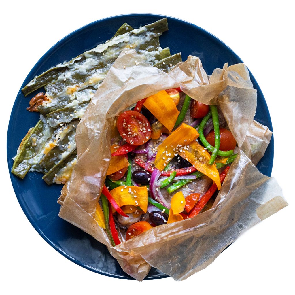 Sirve el papillote en el papel de horno y abre con unas tijeras justo antes de tomar (cuidado con el vapor que desprende porque quema). Acompaña con las judías.