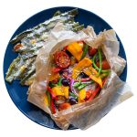 Sazona el chicharro. Forra una bandeja con papel de horno y coloca en el centro todos los ingredientes (excepto las judías gratinadas). Rocía con 3 Tbsp aceite de oliva.