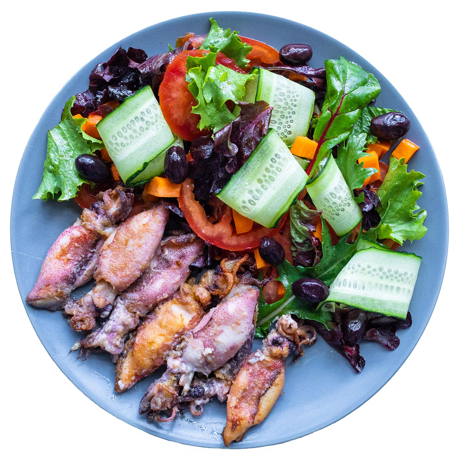 Pon una sartén a fuego medio-alto con el aceite de oliva. Cuando esté caliente sin que llegue a humear, añade los chipirones (en varias tandas sin amontonar) y fríe durante 3 minutos o hasta que se doren un poco. Retira sobre papel absorbente.