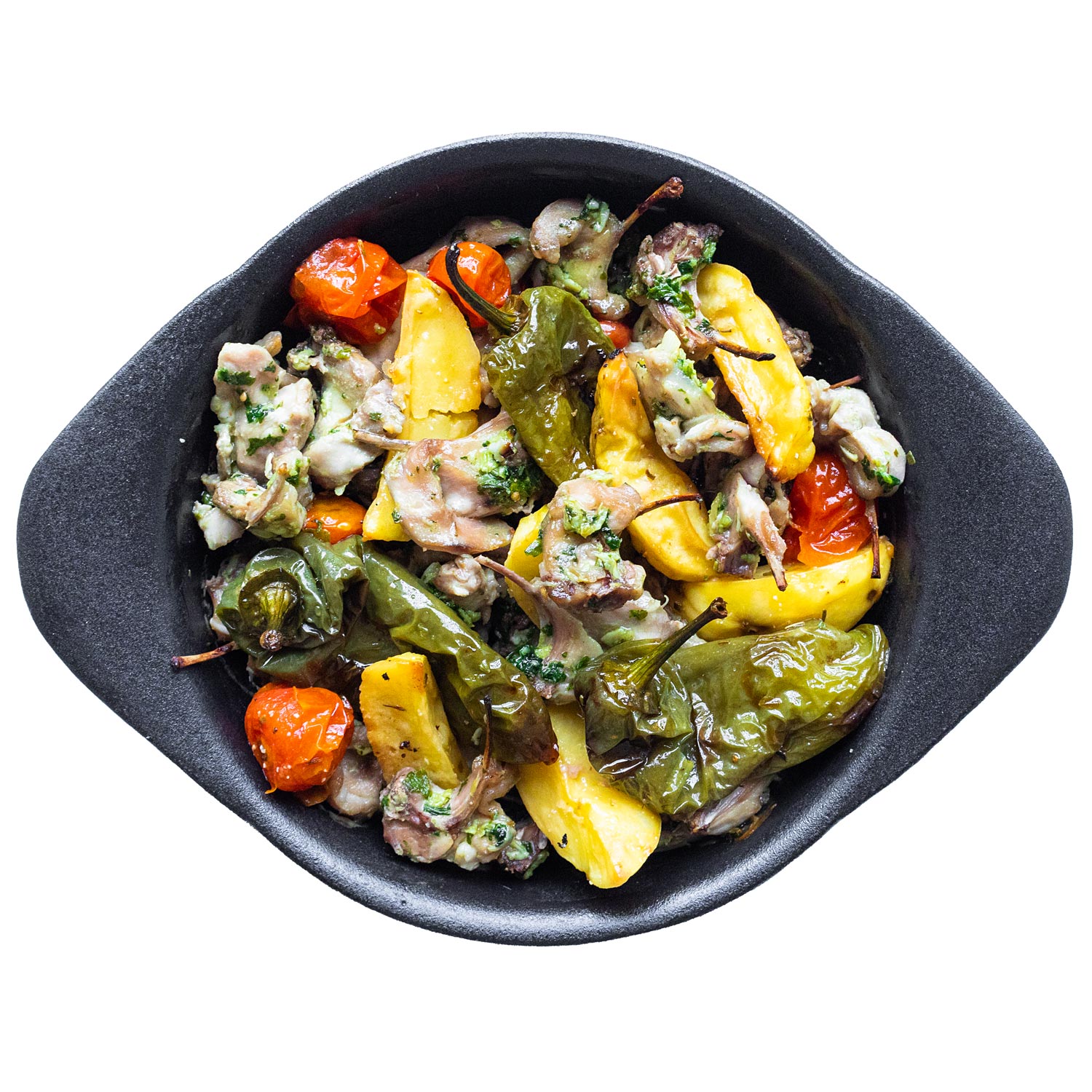 Hornea a media altura durante 25-30 minutos o hasta que las verduras estén blandas. Cuando queden 6-8 minutos, añade las chuletillas sobre las verduras y coloca en la parte alta del horno. Comprueba que están en su punto si la carne se separa fácilmente del hueso. Sirve.