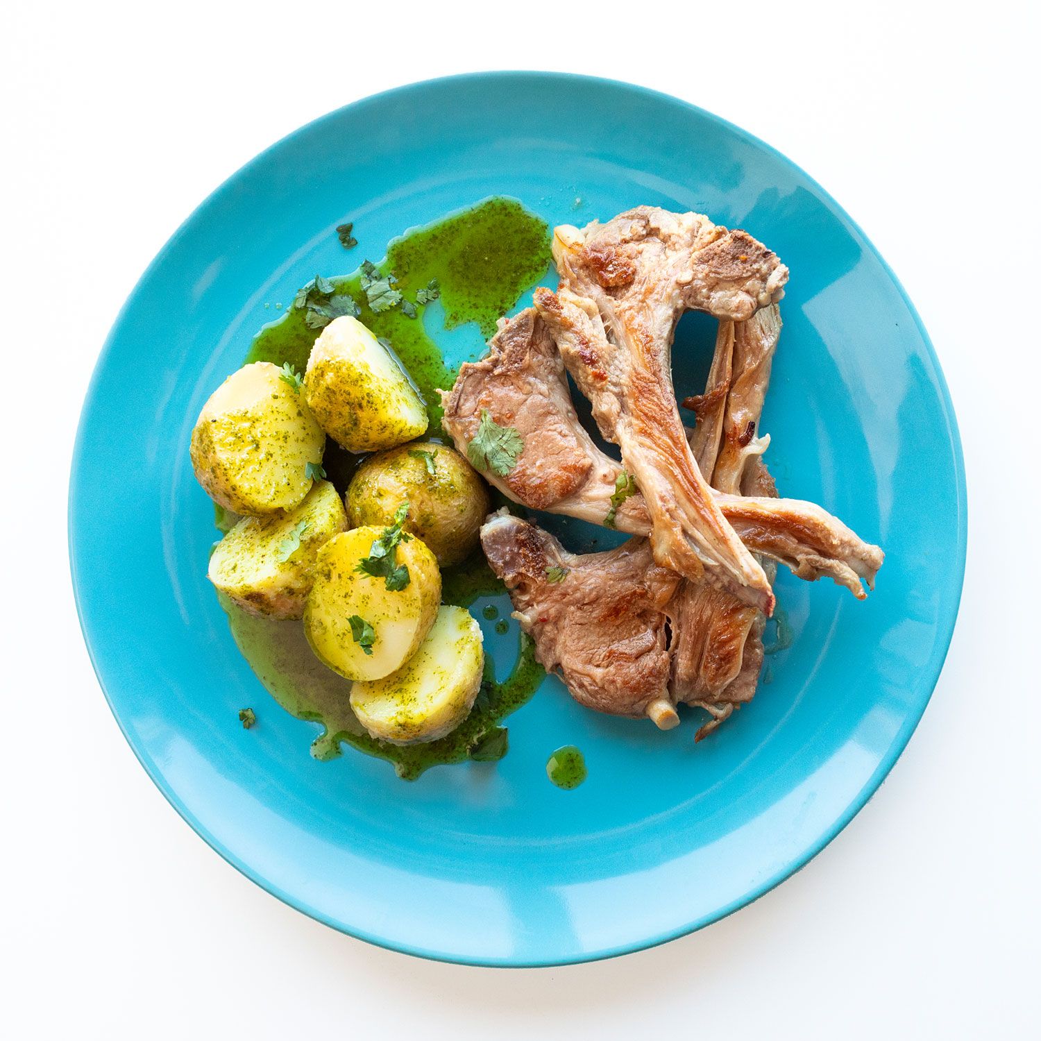 Sirve las chuletillas acompañadas de las papas y salsea con el mojo.