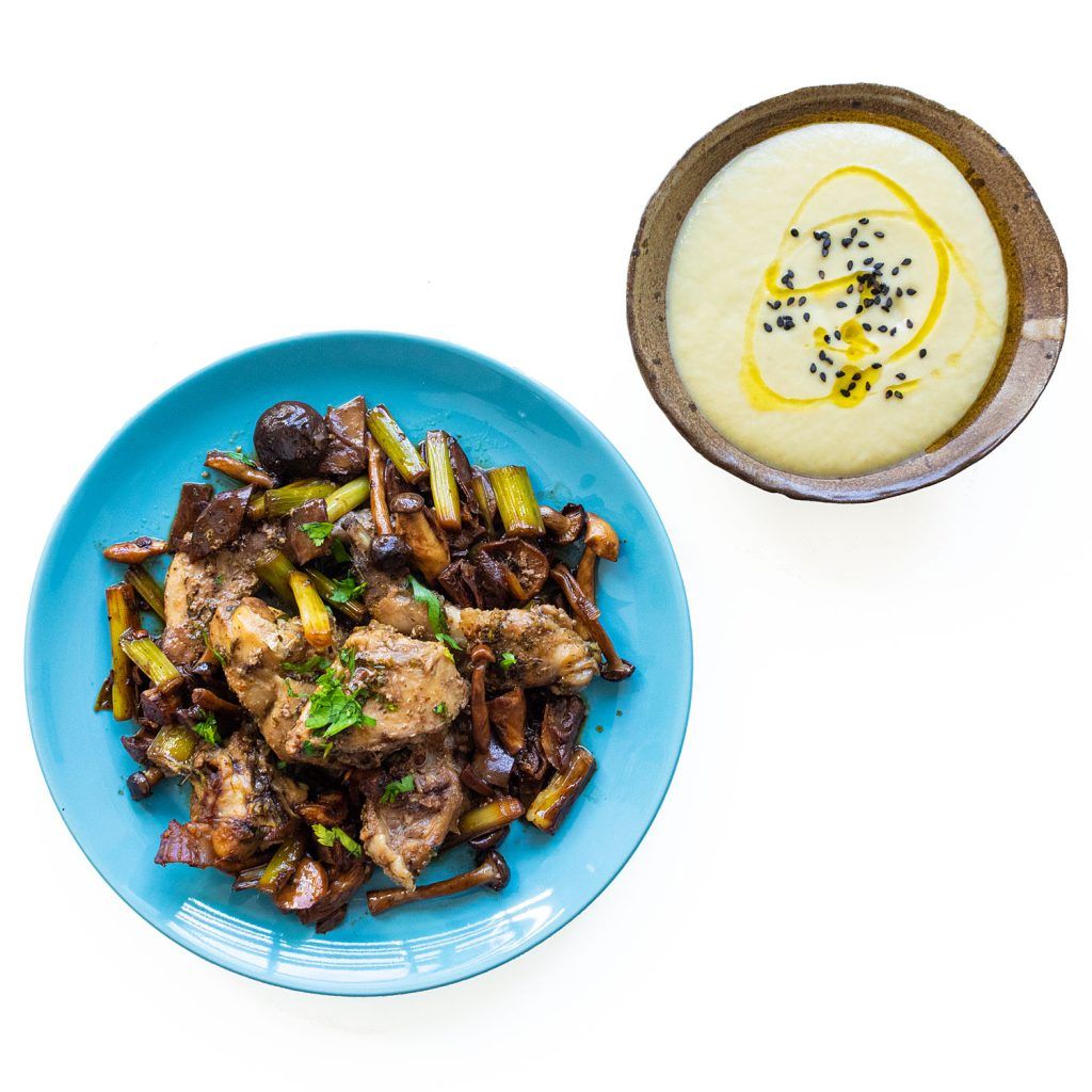 Decora el conejo con el resto del perejil y la crema con el sésamo. Sirve.