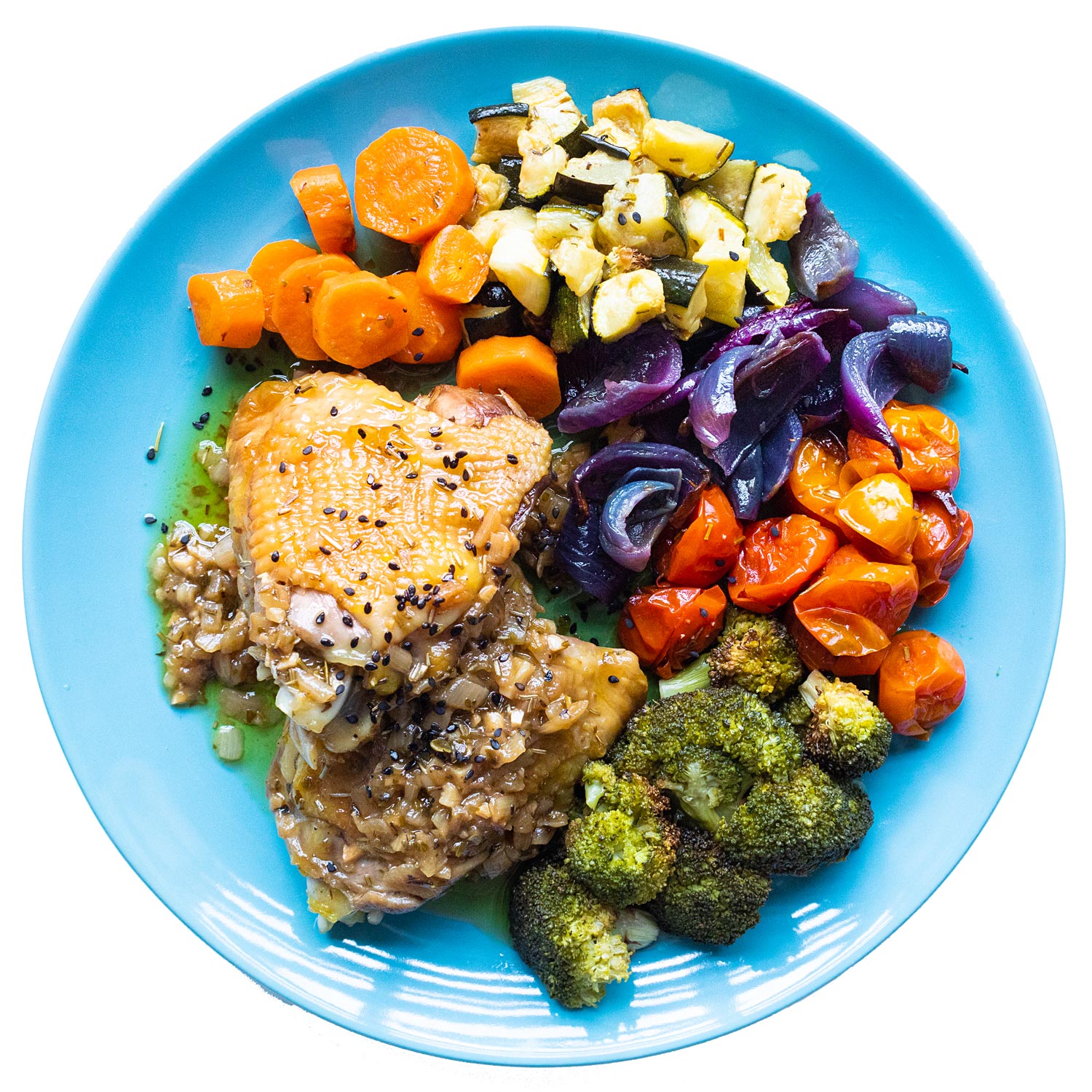 Sirve el pollo con las verduras y decora con las semillas + el perejil.
