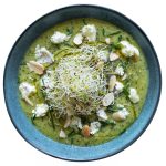 Espolvorea sobre la crema el queso + los frutos secos y decora con los brotes.