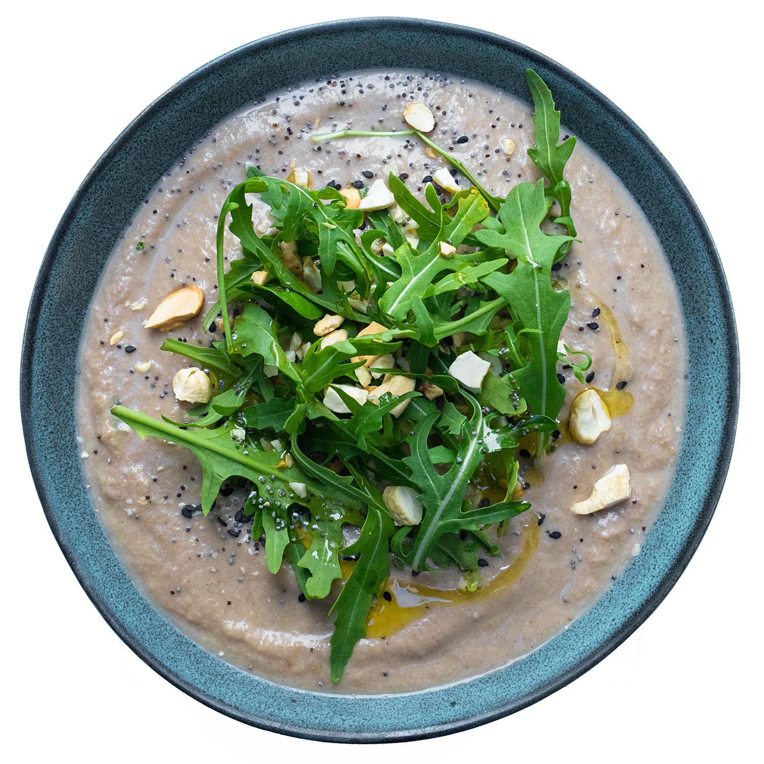 Tritura todos los ingredientes (excepto 1 cup caldo) + ¼ tsp sal durante 2-3 minutos o hasta que te quede una crema lisa. Si te ha quedado muy densa, añade un poco más de caldo. Prueba el punto de sal.