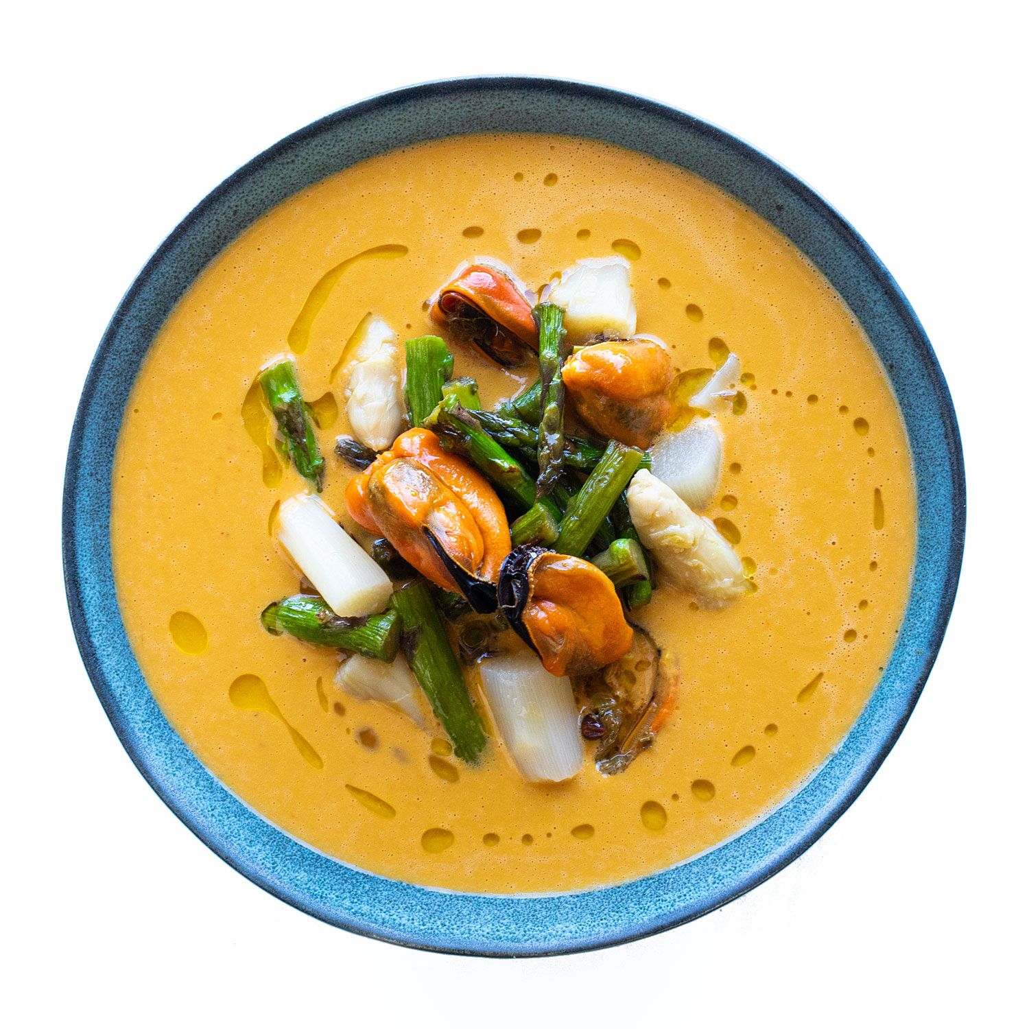 Sirve la crema en boles y añade los espárragos verdes y blancos + los mejillones.