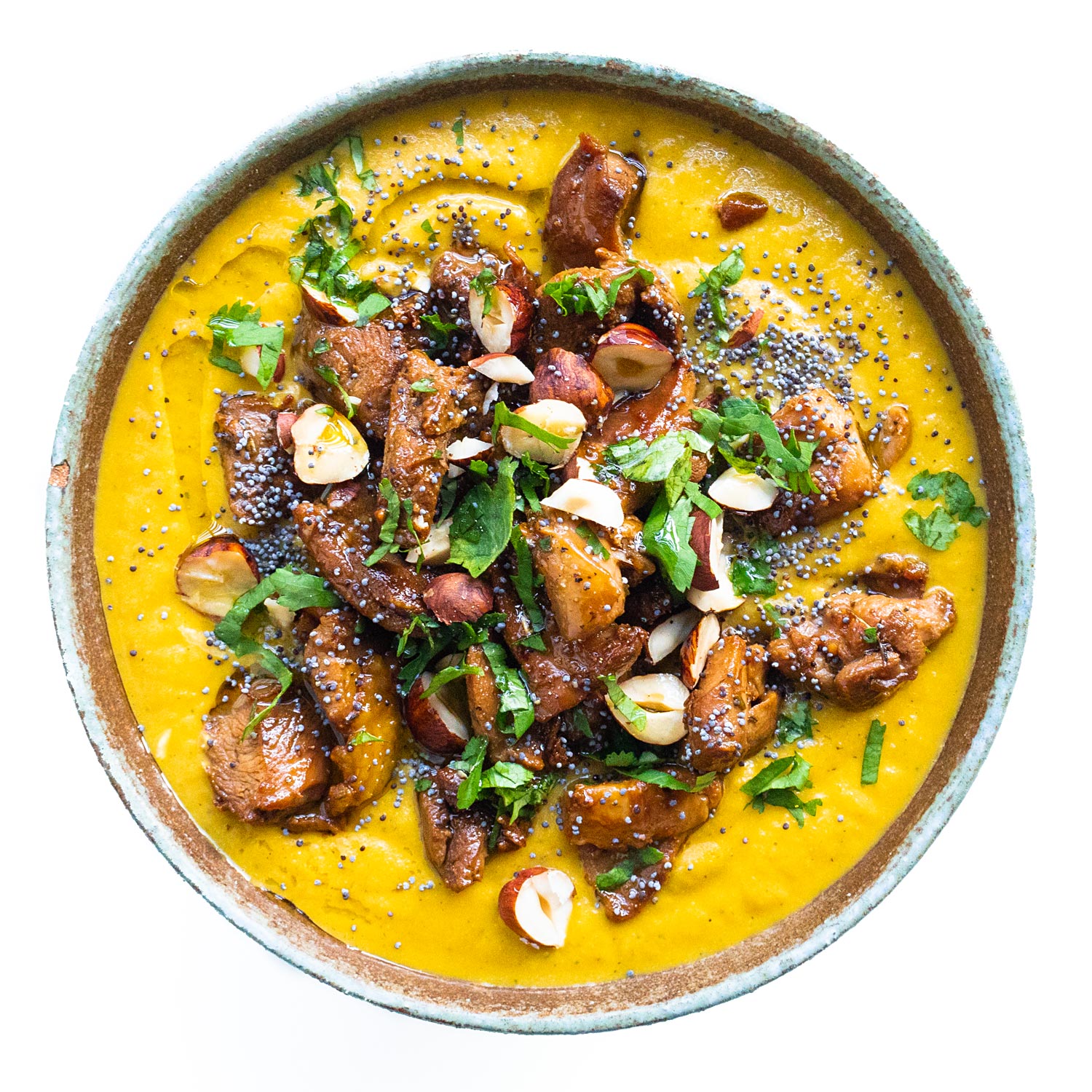 Sirve la crema y coloca encima el tempeh + las avellanas. Decora con las semillas + el cilantro.