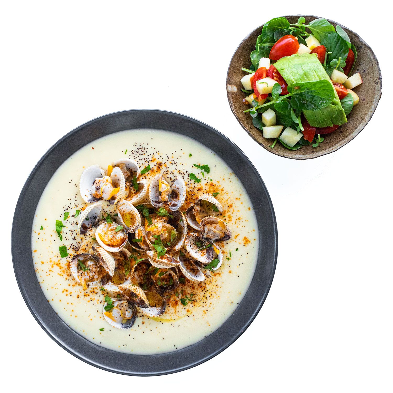 Aliña las frReparte la crema en boles y coloca encima los berberechos. Espolvorea las semillas + el pimentón.