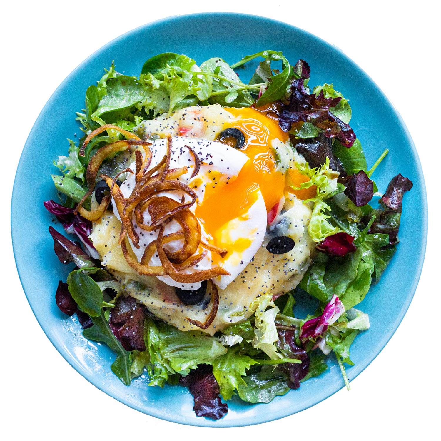 Sirve la crema con el huevo y acompaña con la ensalada. Decora con los brotes.