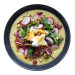 Sirve la crema y coloca encima el huevo + el jamón + la rúcula y los rabanitos. Decora con las nueces + las semillas.