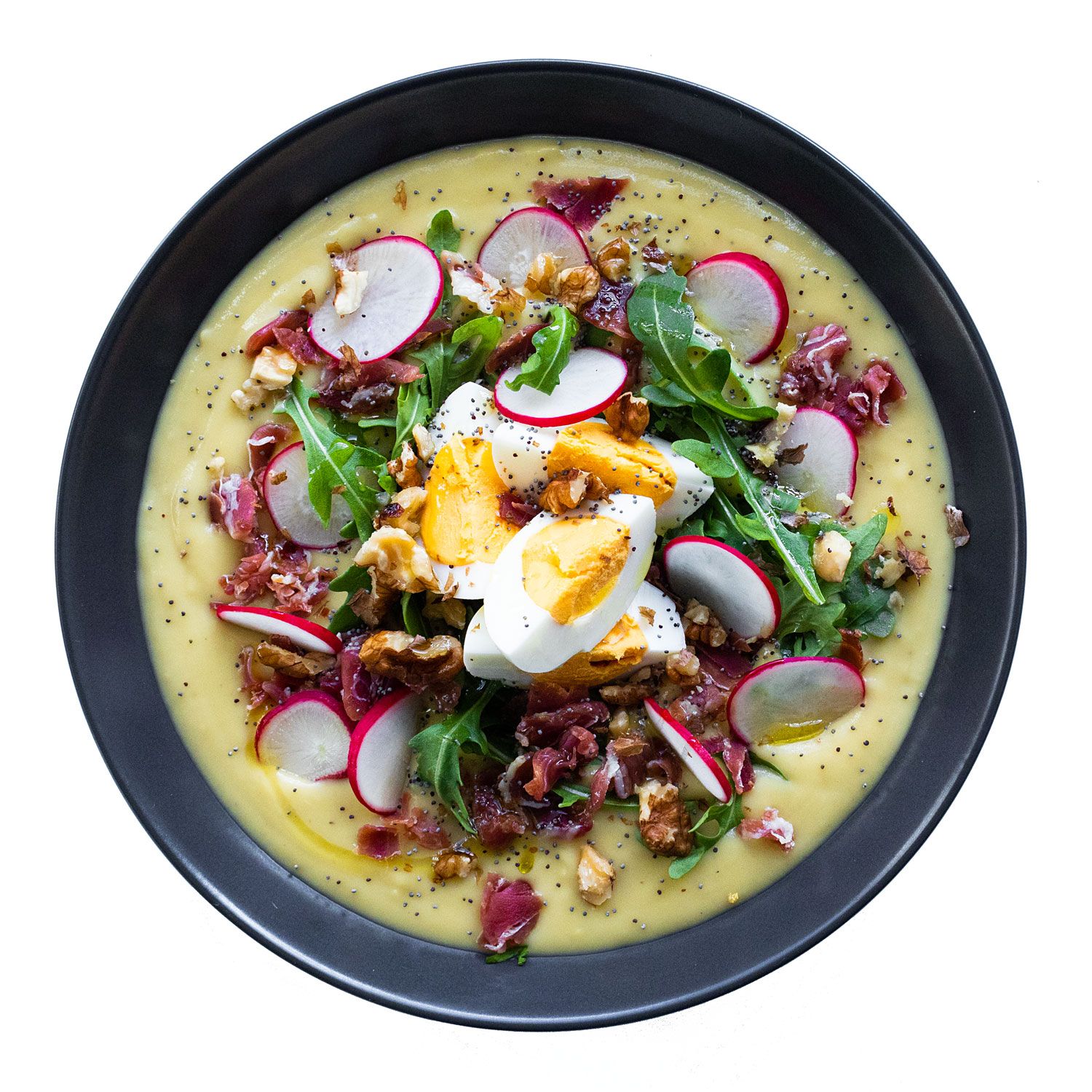 Sirve la crema y coloca encima el huevo + el jamón + la rúcula y los rabanitos. Decora con las nueces + las semillas.