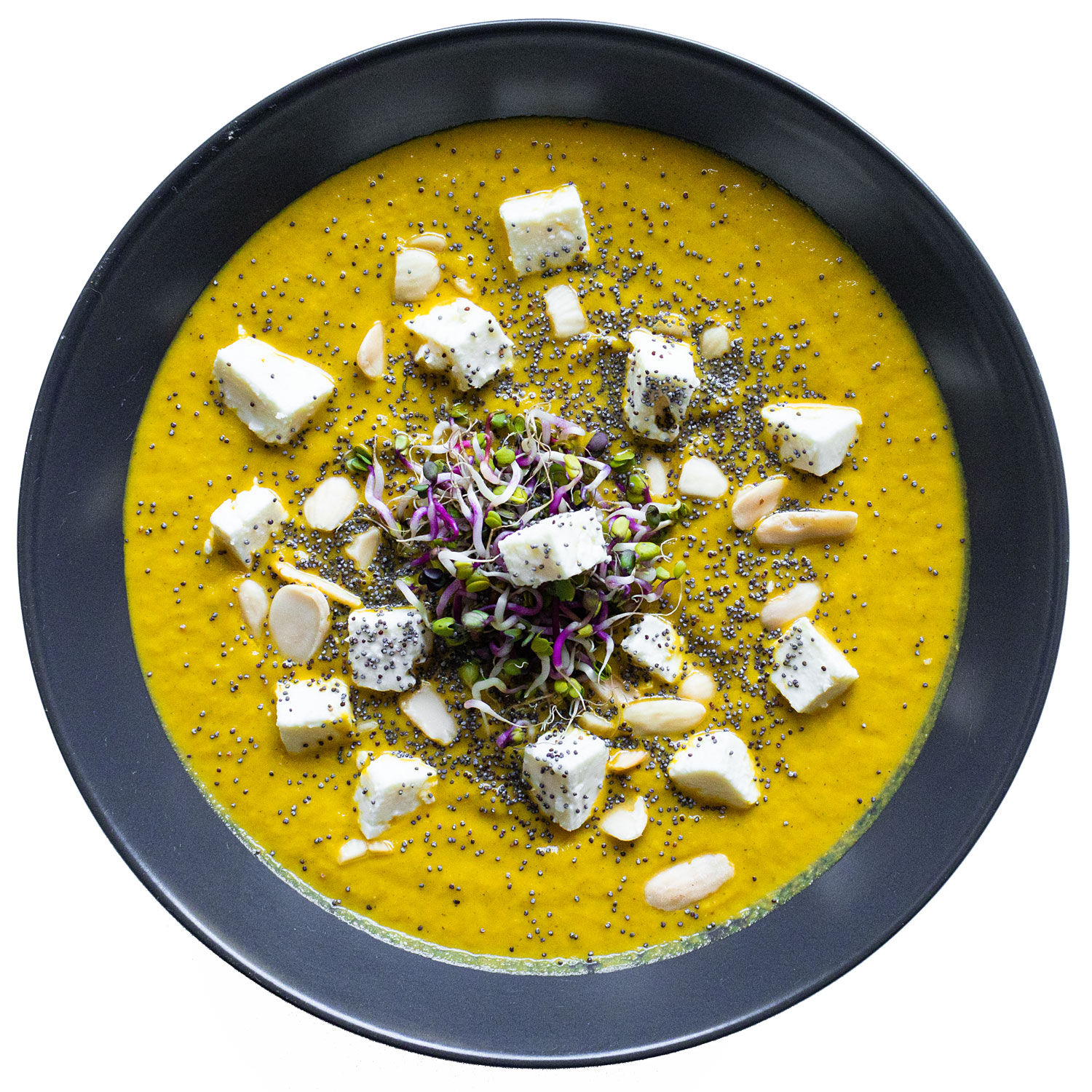 Tritura las verduras asadas + el resto de ingredientes + ¼ tsp sal durante 1 minuto o hasta que la mezcla sea homogénea. Prueba el punto de sal.