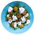 Sirve las croquetas sobre la rúcula y salsea con el tzatziki. Decora con las semillas.