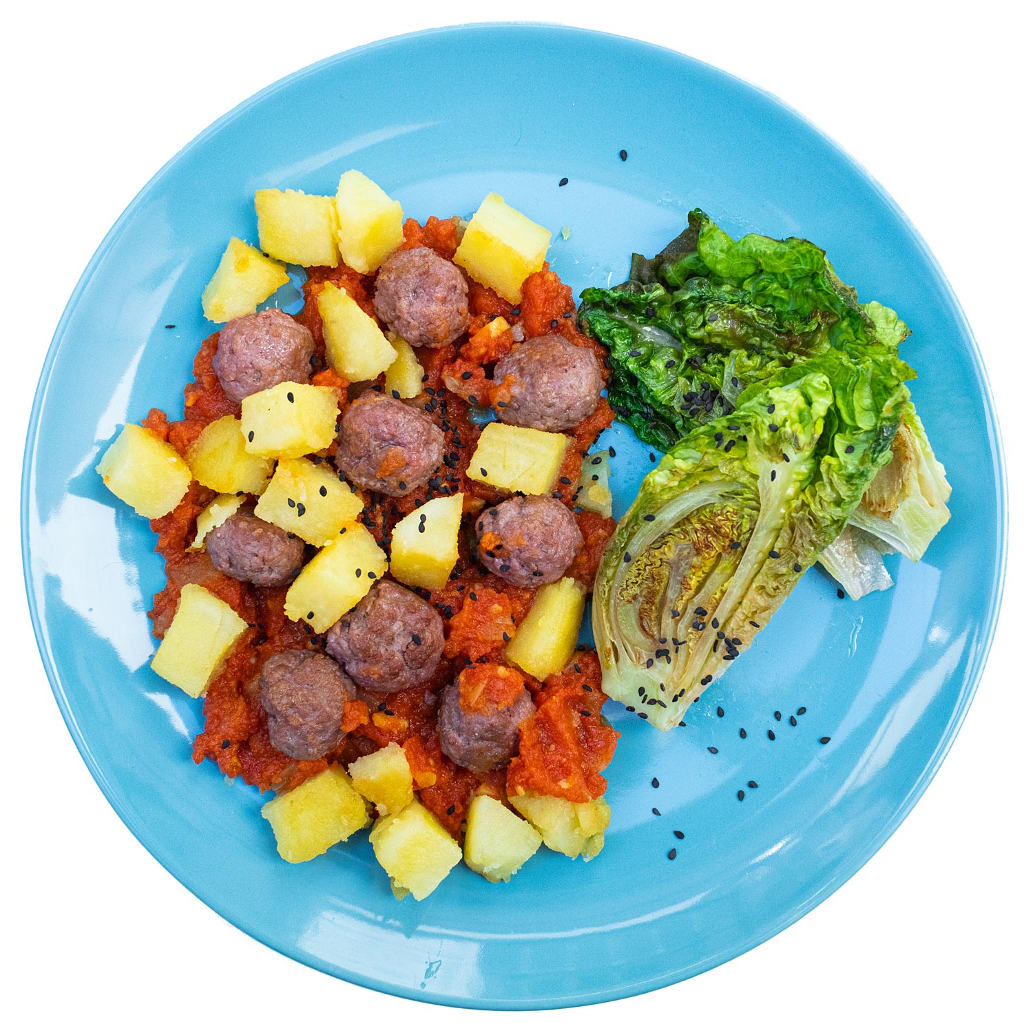 Pon una sartén a fuego medio con 2 Tbsp aceite de oliva y fríe las bolitas durante 5 minutos o hasta que se doren un poco. Remueve de vez en cuando para que se cocinen por igual. Mezcla con la salsa.