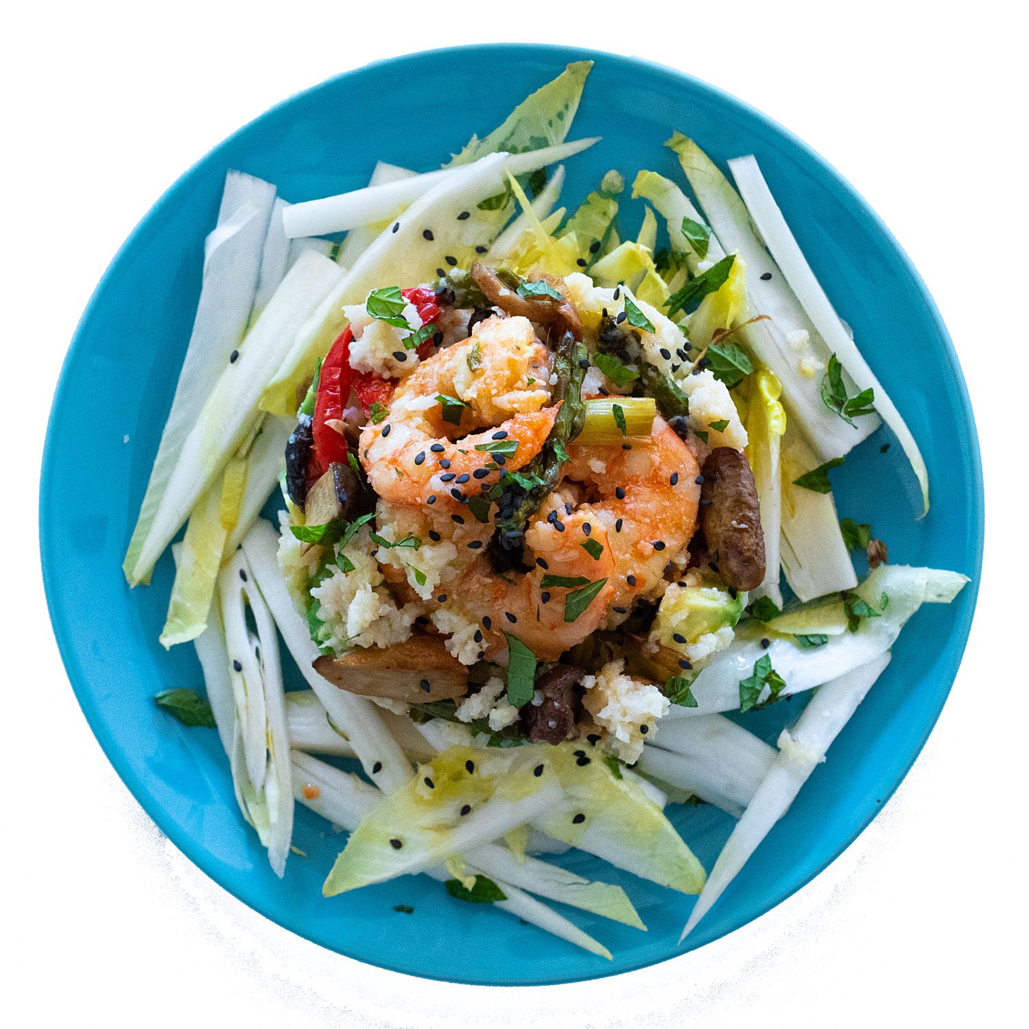 Mezcla las verduras con el cuscús + los langostinos + las pasas + los anacardos + las aceitunas. Prueba el punto de sal.