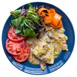 Sirve la dorada en salsa y acompaña con la ensalada.