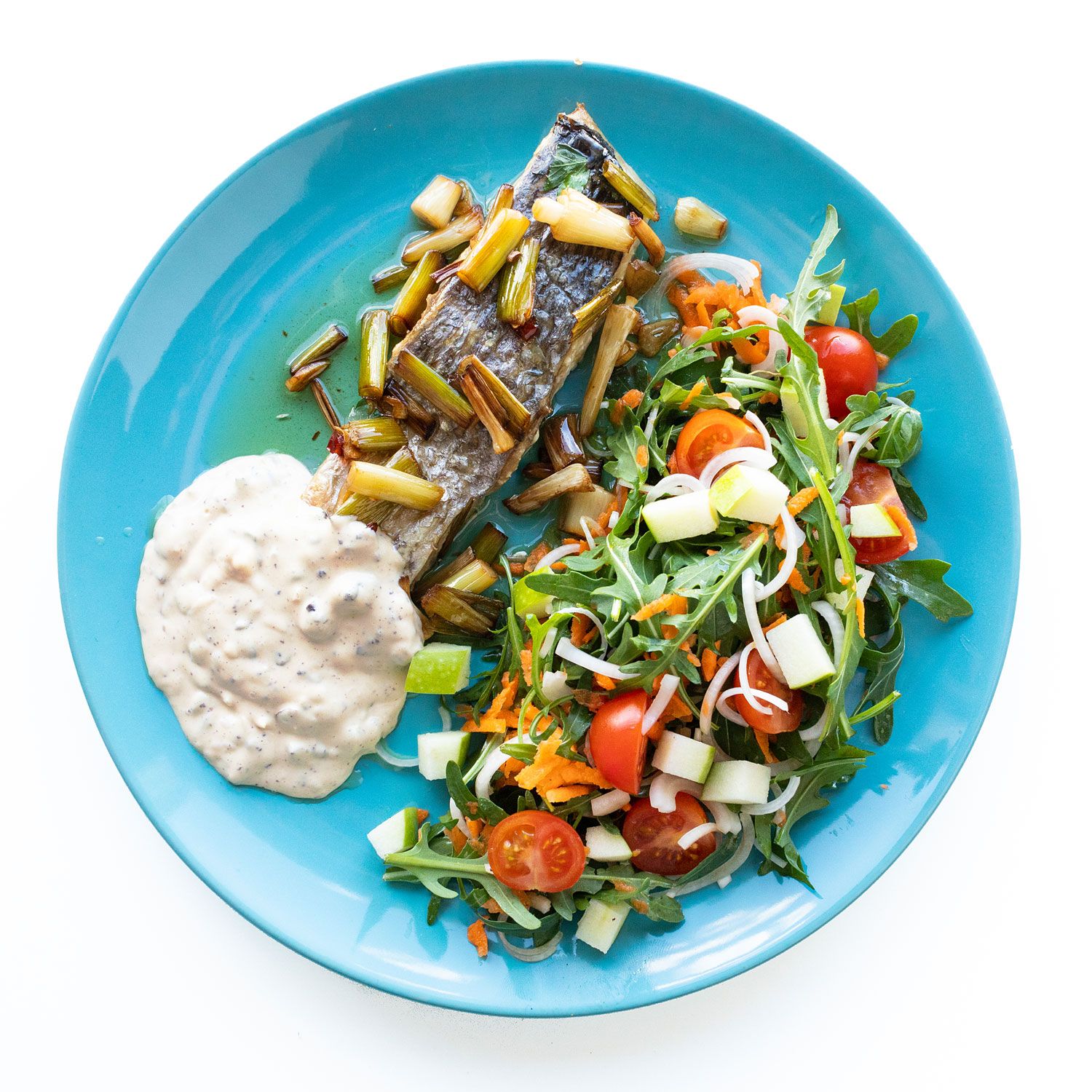 Pon una sartén a fuego medio. Añade 2 Tbsp aceite de oliva y sazona el pescado con ½ tsp sal. Cocina 3 minutos por cada lado, primero con la parte de la piel hacia abajo. Retira.