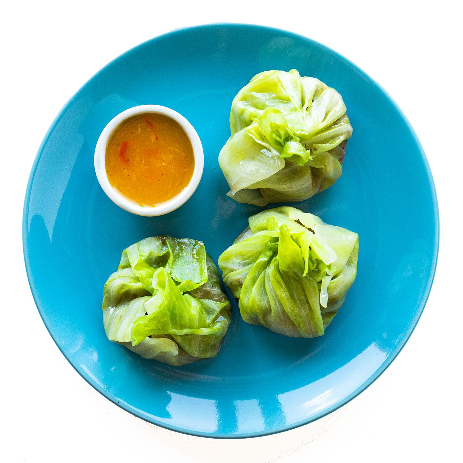 Cierra las hojas de col formando un saquito redondo girando la parte superior. Puedes ayudarte con un papel absorbente para hacerlos girar y que mantengan la forma.