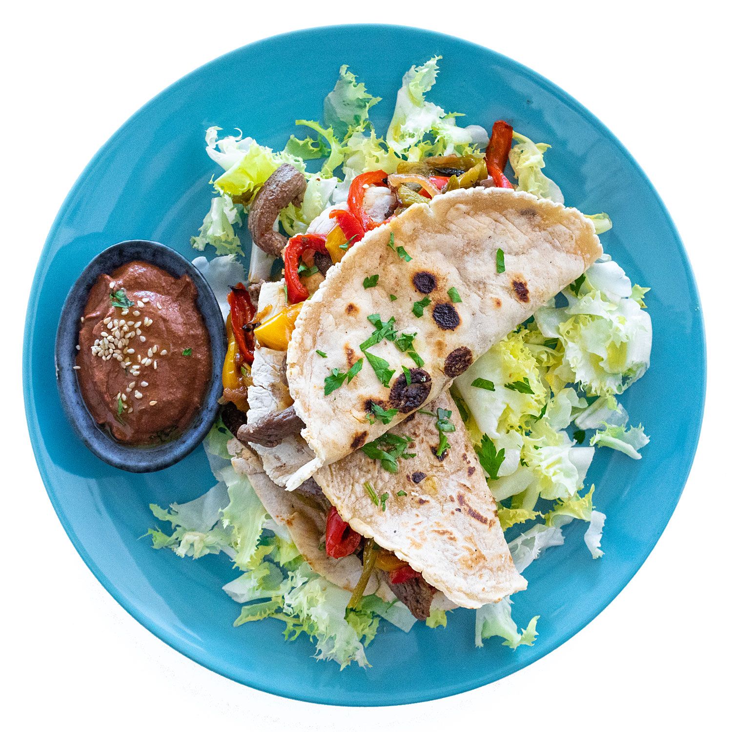 Sirve las enchiladas sobre la escarola. Salsea con el mole y decora con el sésamo + el cilantro.