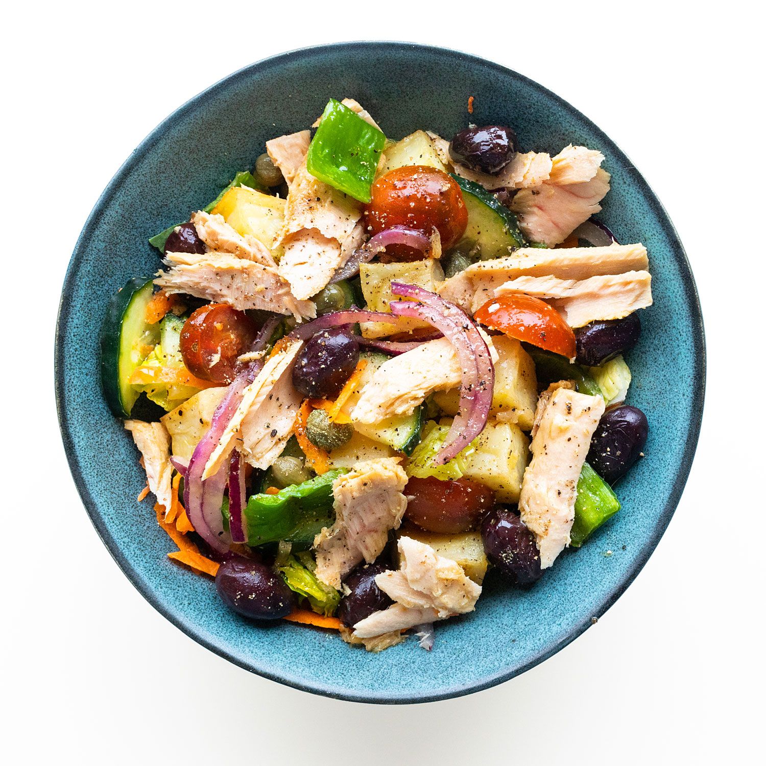 Mezcla en un bol todos los ingredientes de la ensalada + las patatas + ¼ tsp sal. Sirve y disfruta.