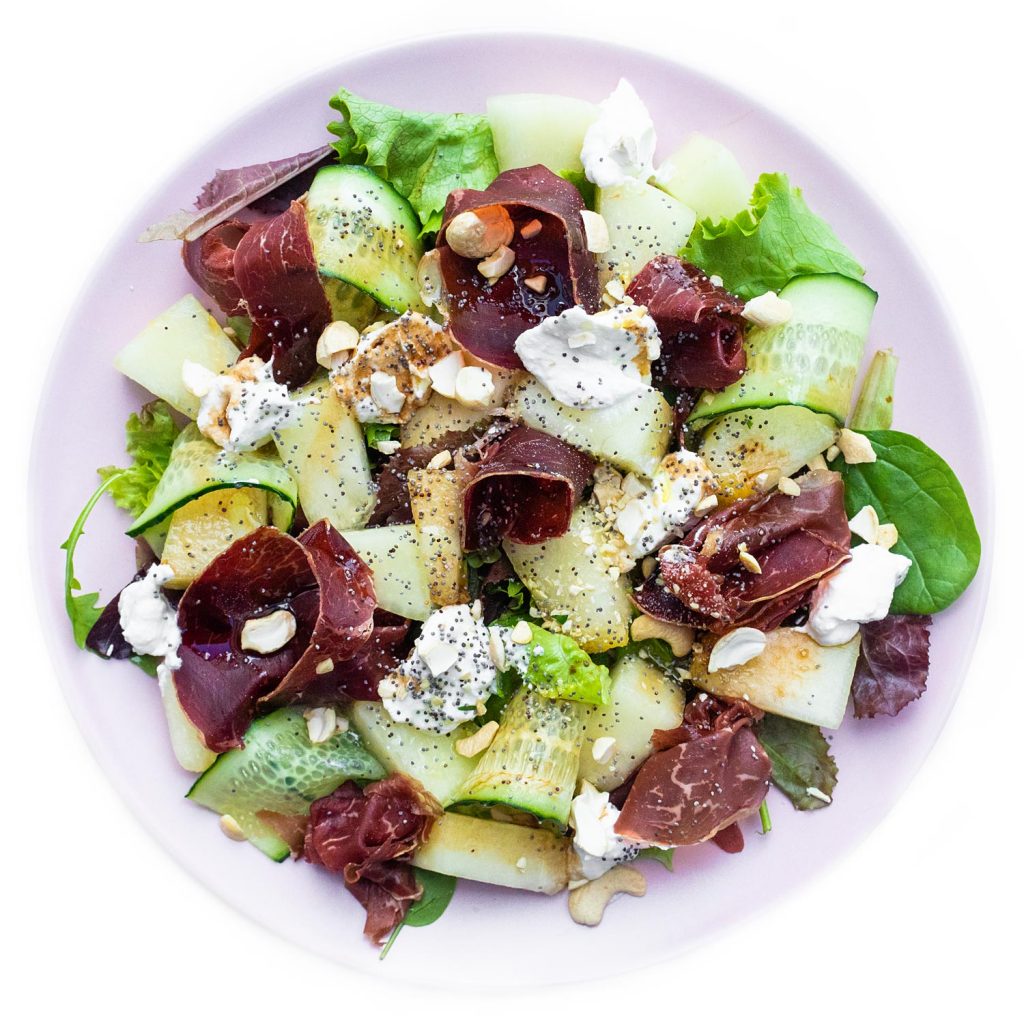 Mezcla en un bol todos los ingredientes (excepto la cecina y las semillas) y aliña.