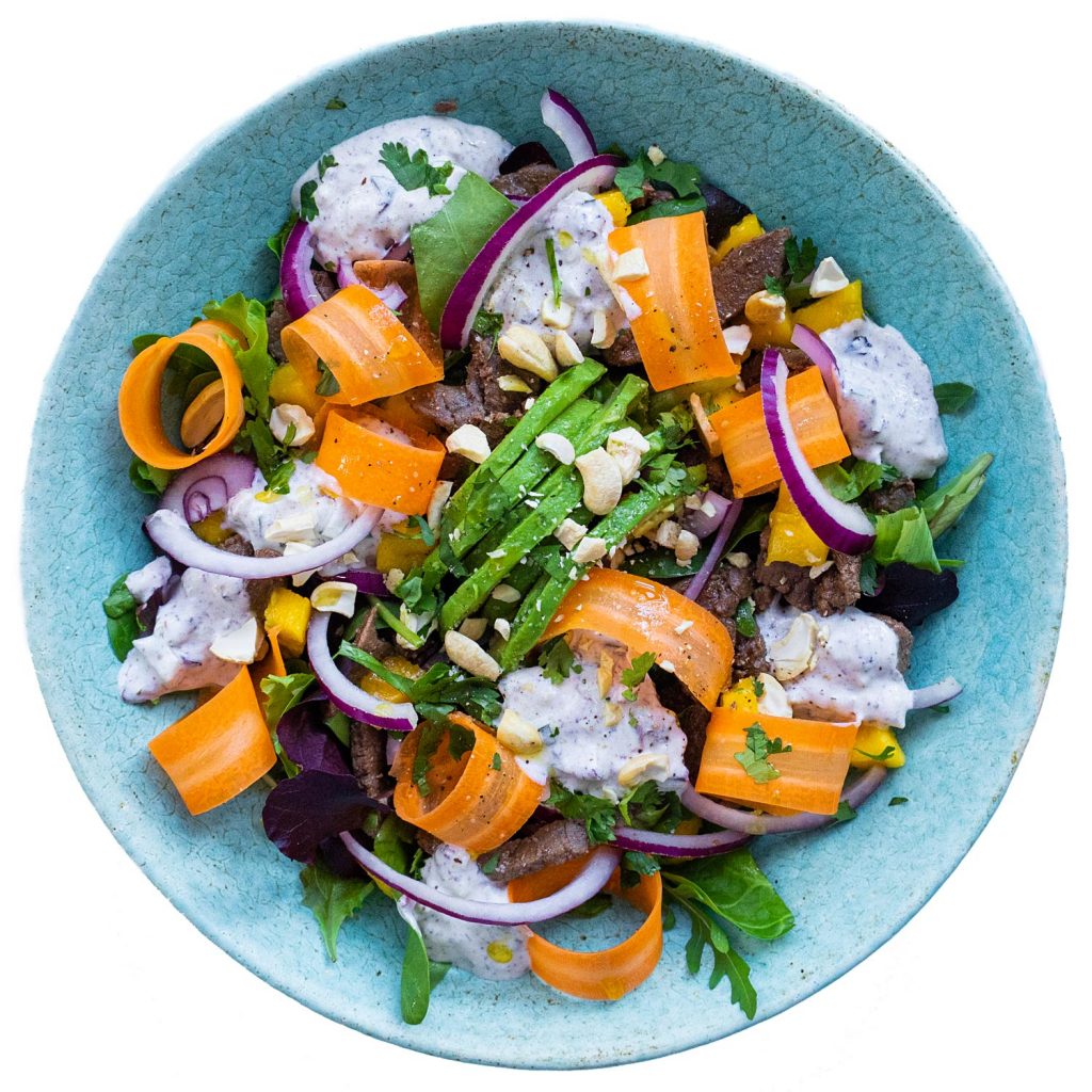 Mezcla todos los ingredientes + la ternera y aliña con el tzatziki.