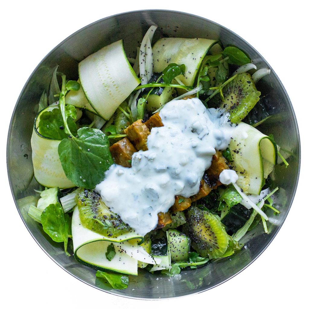 Coloca el tempeh sobre la ensalada, decora con las semillas y sirve.