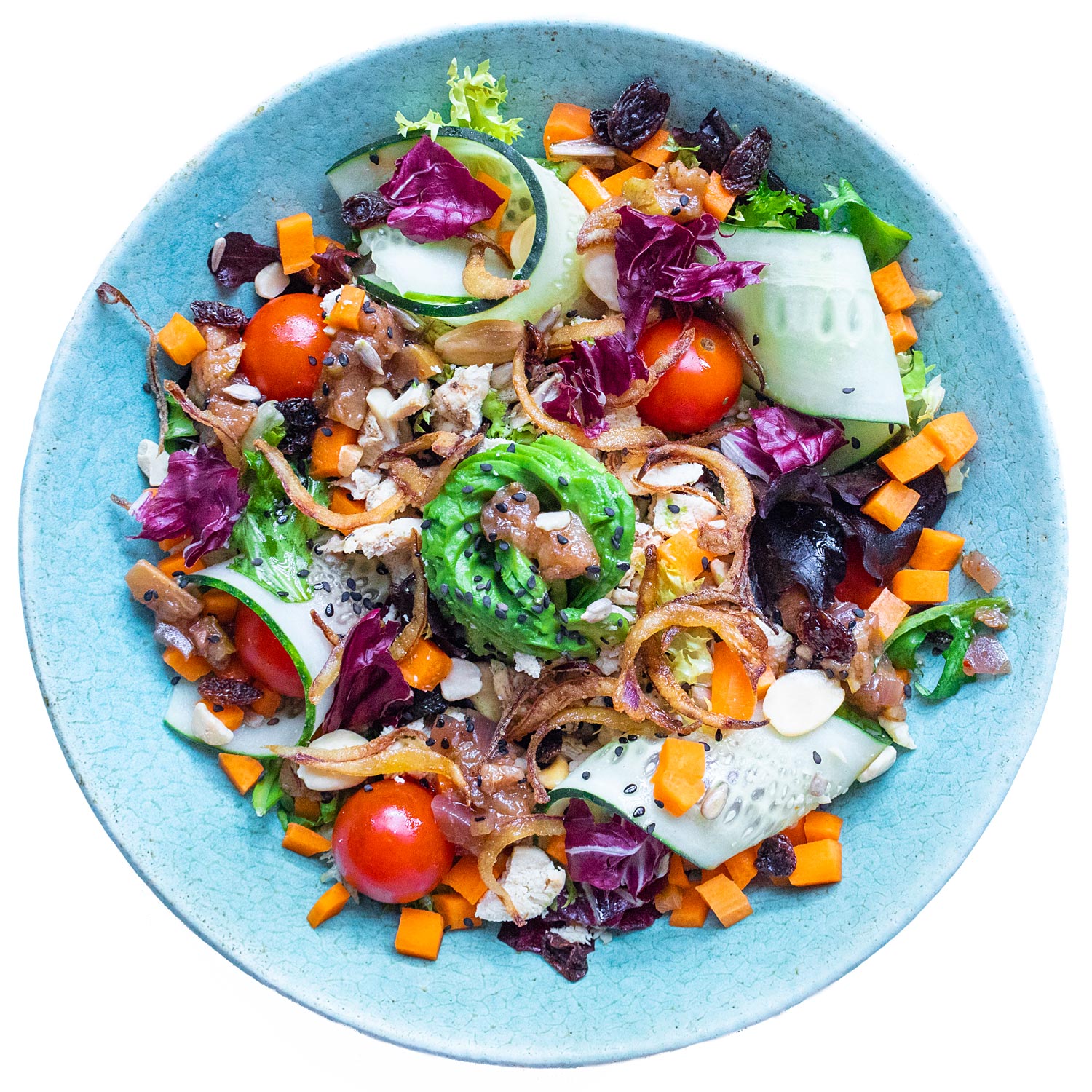 Mezcla en un bol todos los ingredientes. Espolvorea la cebolla y salsea con el chutney. Sirve.