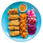 Sirve la merluza con el chimichurri. Acompaña con los pickles y la calabaza.