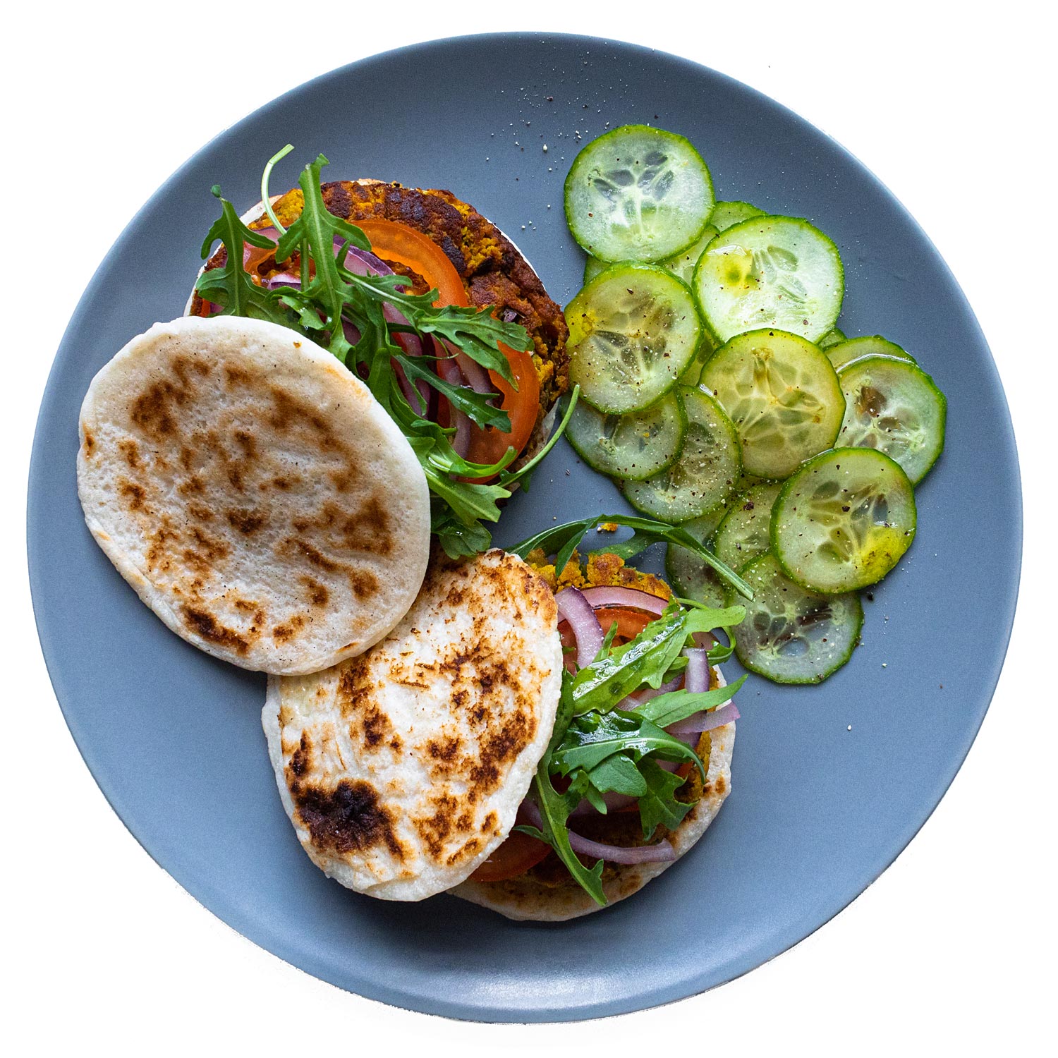 Monta las hamburguesas con el pan + todas las verduras (excepto el pepino).