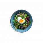 Sirve los guisantes sobre el mezclum y coloca encima el huevo (sustituye por pavo salteado si haces AIP). Decora con la menta.