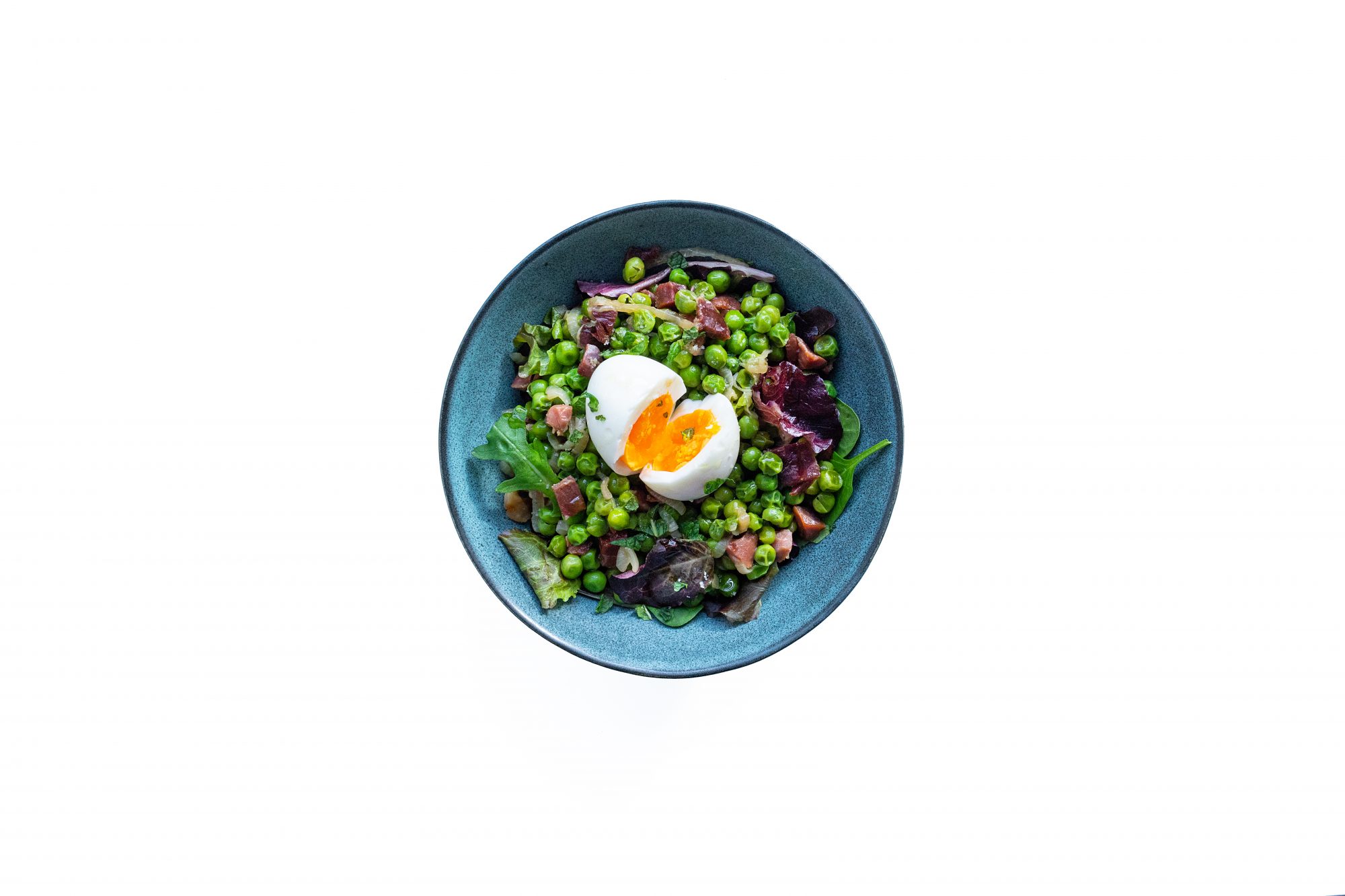 Sirve los guisantes sobre el mezclum y coloca encima el huevo (sustituye por pavo salteado si haces AIP). Decora con la menta.