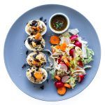 Mezcla el bonito + las verduras asadas + el aguacate y rellena las cáscaras.