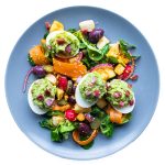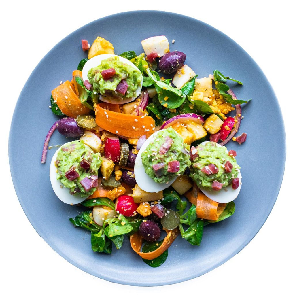 Sirve los huevos (aguacates si haces AIP) rellenos con la ensalada y decora con las semillas.