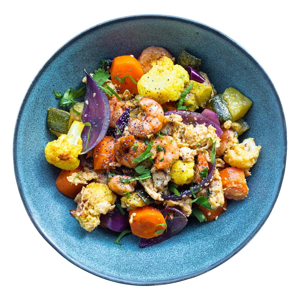 Añade las verduras asadas + el tamari y saltea durante 3 minutos. Si haces AIP, retira la sartén del fuego y añade el aguacate.