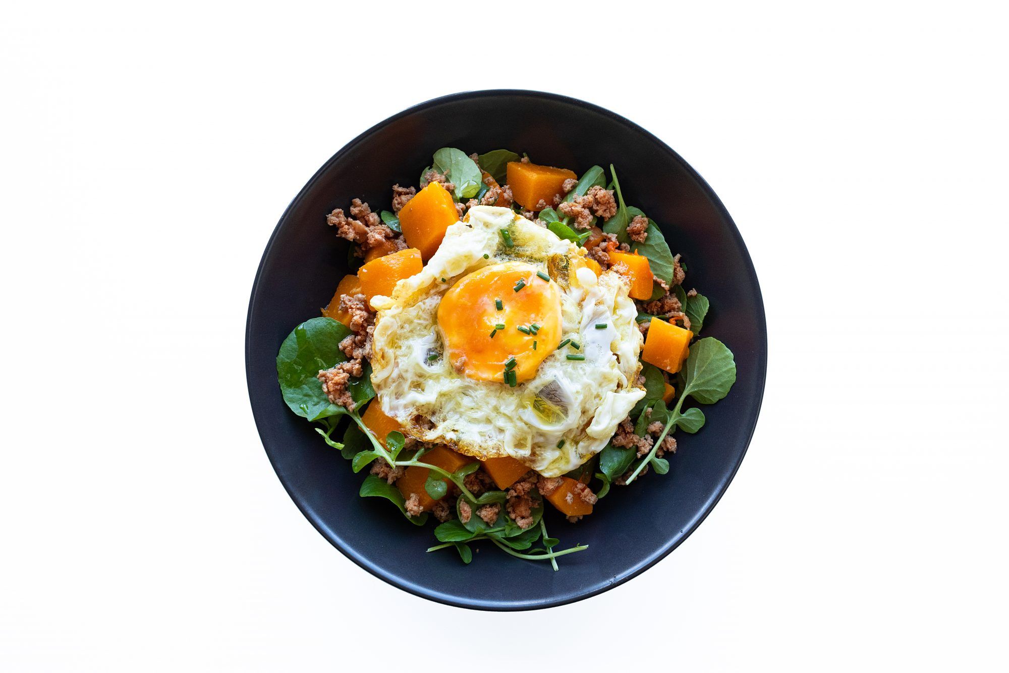 Coloca la calabaza + el huevo + el picadillo sobre los berros. Decora con el cebollino y sirve.